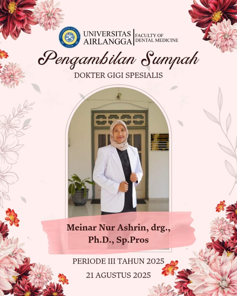 Dua dosen tersebut adalah Meinar Nur Ashrin, drg., PhD., Sp.Pros., yang menuntaskan pendidikan di Program Pendidikan Dokter Gigi Spesialis Prostodonsia, serta Dr. Sarianoferni, drg., M.Kes., Sp.RKG., lulusan Program Pendidikan Dokter Gigi Spesialis Radiologi Kedokteran Gigi.