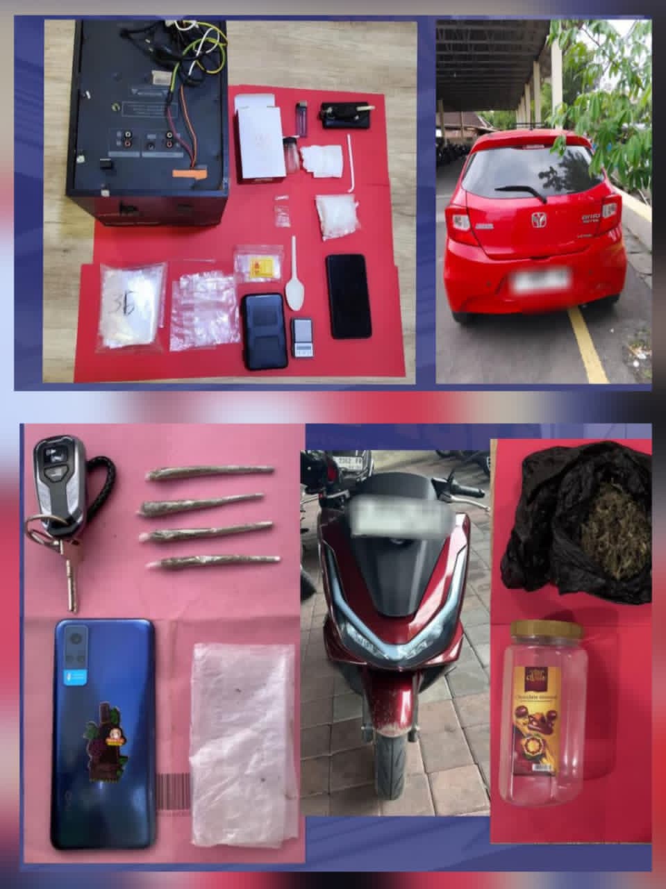 Dari hasil penggeledahan, Polisi menemukan narkotika jenis ganja yang disimpan di dalam jok sepeda motor milik tersangka.