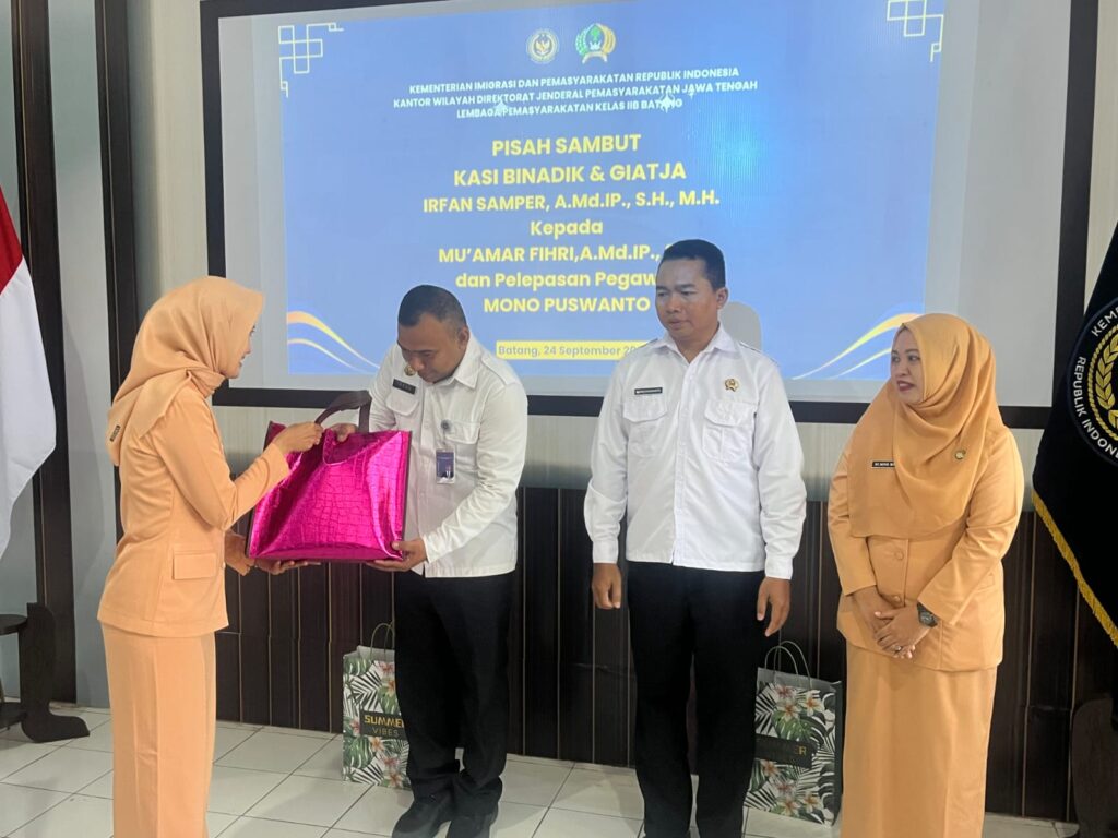 Batang – Lembaga Pemasyarakatan (Lapas) Kelas IIB Batang menggelar kegiatan pisah sambut Kasi Binadik dan Giatja serta pelepasan pegawai, yang diselenggarakan di Aula Lapas Batang, Rabu (24/9). Acara berlangsung penuh hangat dan kebersamaan dengan diikuti oleh Kepala Lapas Batang, Nurhamdan, jajaran struktural, serta seluruh pegawai Lapas Batang.