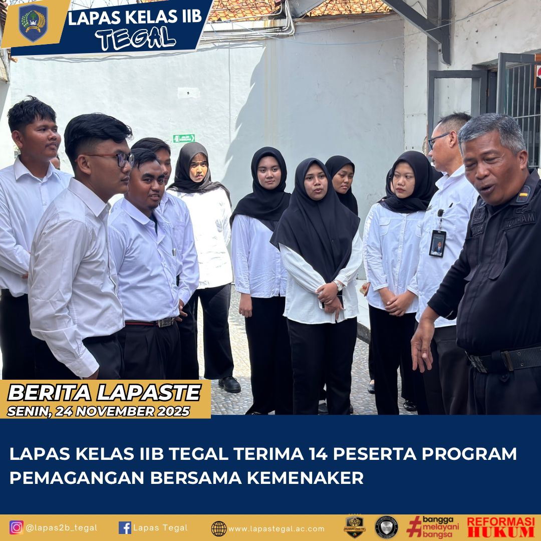 Tegal-Lembaga Pemasyarakatan Kelas IIB Tegal menerima kedatangan 14 orang peserta Program Pemagangan yang merupakan bagian dari kerja sama dengan Kementerian Ketenagakerjaan (Kemenaker). Kedatangan para peserta pemagangan ini disambut hangat oleh jajaran Lapas Tegal sebagai bentuk komitmen dalam meningkatkan kualitas SDM serta memperkuat sinergi antarinstansi.