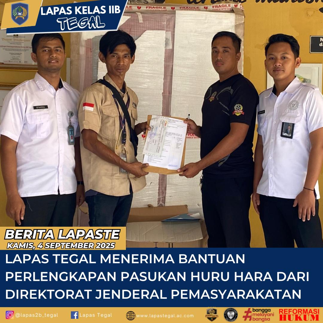 Tegal– Lintasberita9.com- ,Lembaga Pemasyarakatan Kelas IIB Tegal mendapatkan perlengkapan Pasukan Huru Hara (PHH) dan perlengkapan APD Pemadam Kebakaran yang bersumber dari Anggaran Pendapatan dan Belanja Negara (APBN) Direktorat Jenderal Pemasyarakatan pada Kamis, (04/09/25)