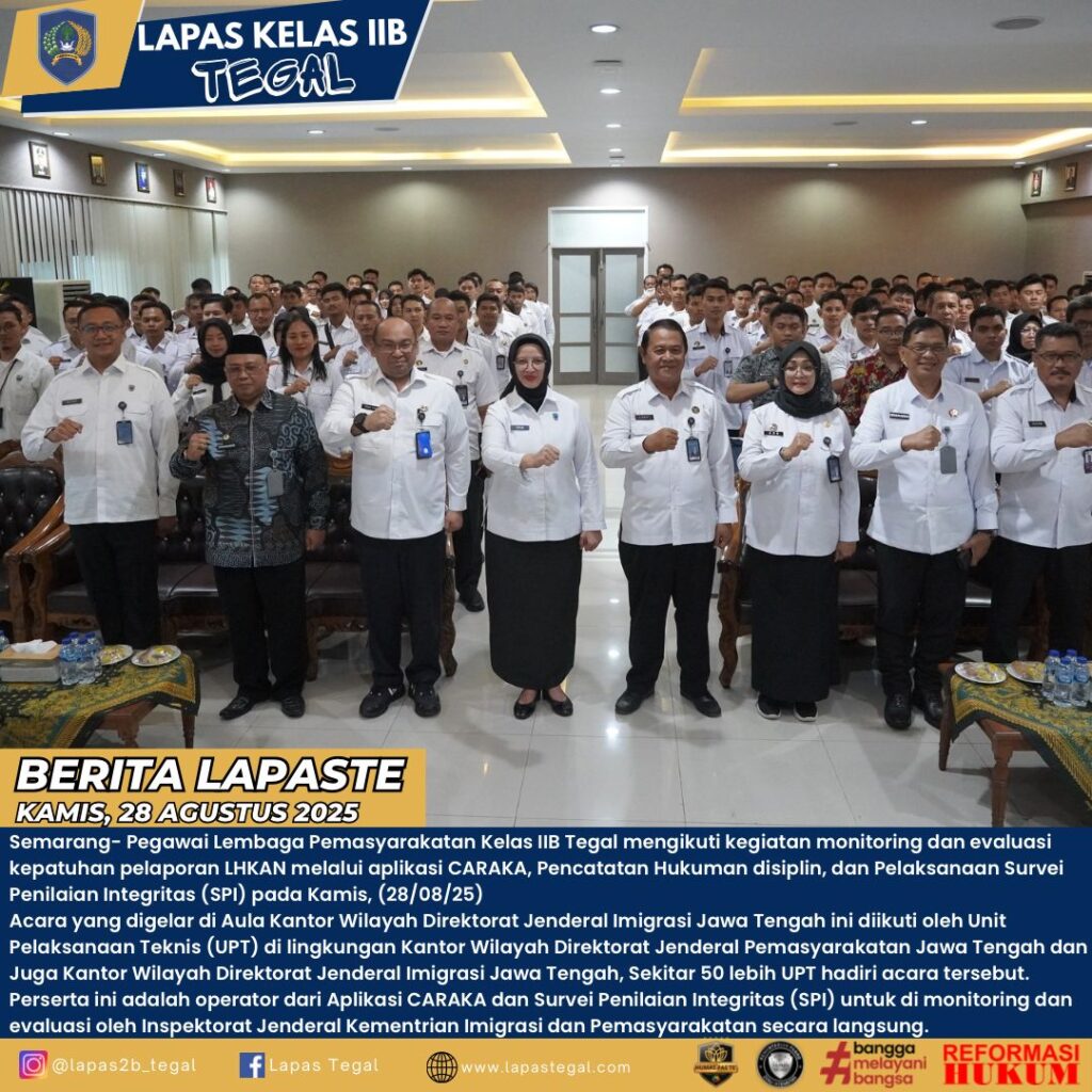 Semarang– Lintaberita9.com- ,Pegawai Lembaga Pemasyarakatan Kelas IIB Tegal mengikuti kegiatan monitoring dan evaluasi kepatuhan pelaporan LHKAN melalui aplikasi CARAKA, Pencatatan Hukuman disiplin, dan Pelaksanaan Survei Penilaian Integritas (SPI) pada Kamis, (28/08/25)