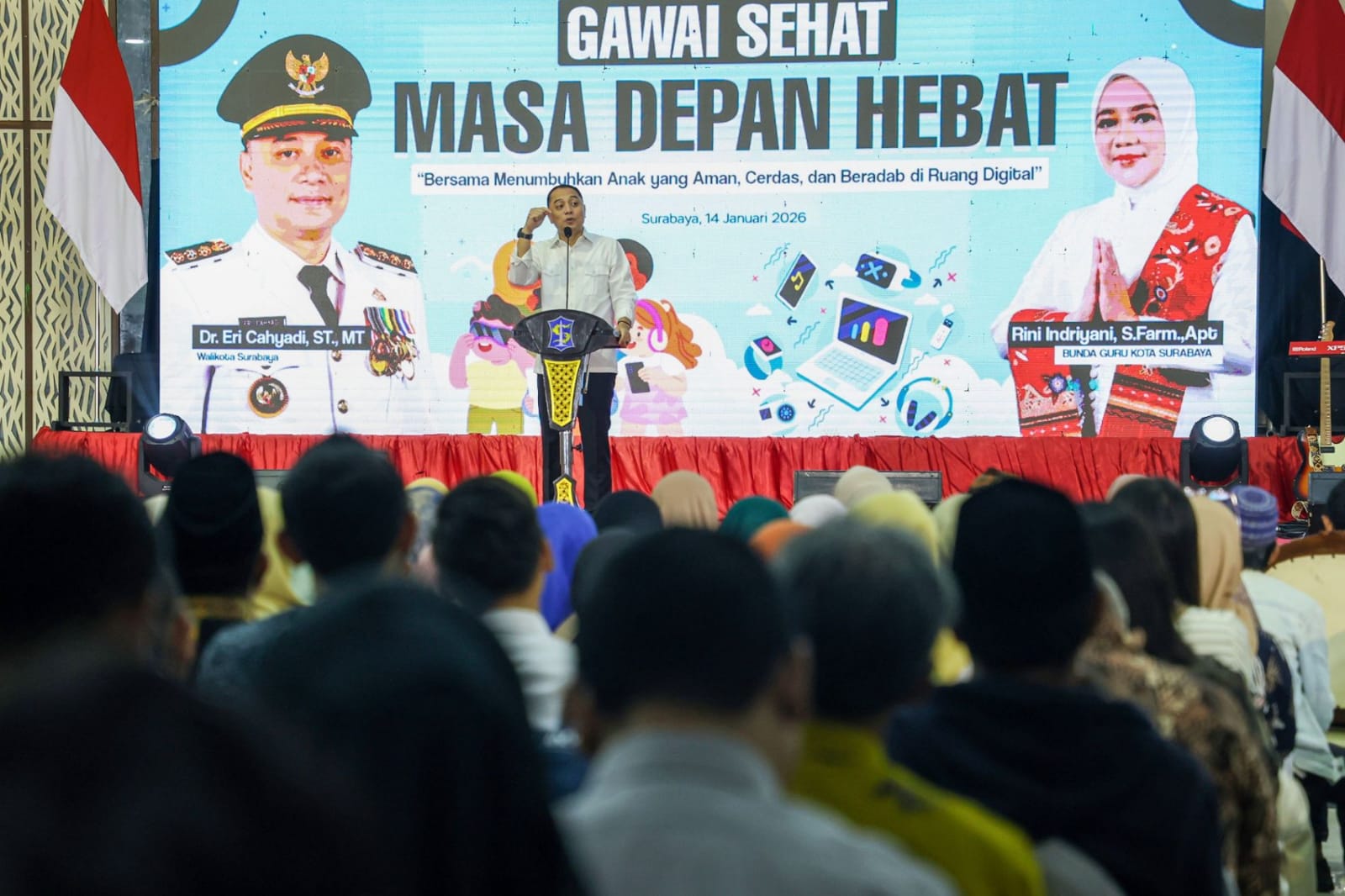Surabaya, – Pemerintah Kota (Pemkot) Surabaya menggelar sosialisasi Surat Edaran (SE) Wali Kota Surabaya Nomor 400.2.4/34733/436.7.8/2025 tentang Penggunaan Gawai (HP) dan Internet untuk Anak di Kota Surabaya. Kegiatan ini berlangsung di Convention Hall Surabaya, Rabu (14/1/2026), dengan menghadirkan sejumlah narasumber strategis, mulai dari Densus 88, Badan Narkotika Nasional (BNN), Forum Satu Data, hingga Polrestabes Surabaya.