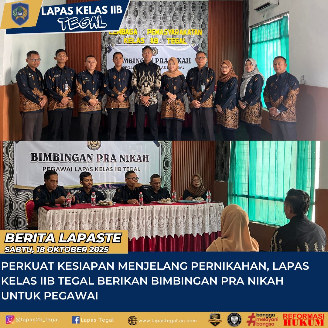 Tegal, 18 Oktober 2025— Lembaga Pemasyarakatan Kelas IIB Tegal melaksanakan kegiatan Penguatan Bimbingan Pra Nikah bagi pegawai atas nama Lilis Puspasari beserta calon suami, bertempat di Aula Lapas Kelas IIB Tegal.