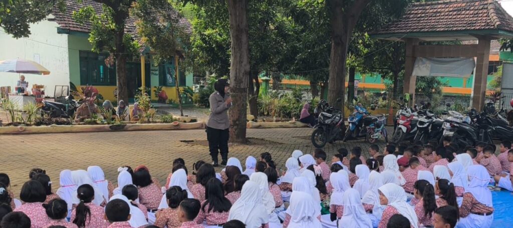 Bhabinkamtibmas Polsek Beji, Brigpol Andriyani, memberikan penyuluhan tentang bahaya bullying dan pentingnya keselamatan berlalu lintas kepada para siswa SDN Sidowayah 1, Beji.