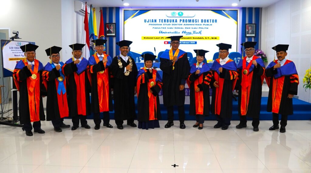 Surabaya – lintasberita9.com- ,Program Doktoral Administrasi Publik Fakultas Ilmu Sosial dan Ilmu Politik (FISIP) Universitas Hang Tuah (UHT) kembali mencetak lulusan doktor. John David Nalasakti Sondakh, S.T., M.M. resmi meraih gelar Doktor Administrasi Publik setelah menjalani sidang disertasi pada Minggu (8/2/2026) di Gedung Pascasarjana Universitas Hang Tuah lantai 5.