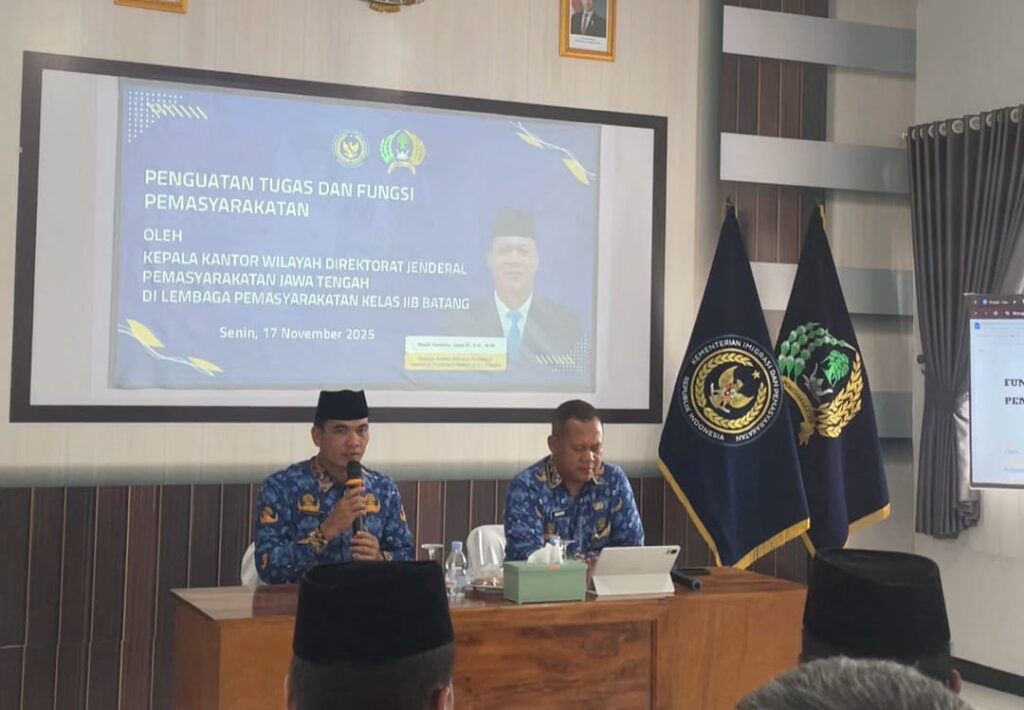 Batang – lintasberita9.com- ,Lembaga Pemasyarakatan (Lapas) Kelas IIB Batang menerima penguatan tugas dan fungsi pemasyarakatan dari Kepala Kantor Wilayah Direktorat Jenderal Pemasyarakatan Jawa Tengah, Mardi Santoso, Senin (17/11). Kegiatan yang digelar di Aula Lapas Batang ini diikuti oleh Kepala Lapas Batang, Nurhamdan, jajaran struktural, serta jajaran pegawai Lapas Batang dengan penuh khidmat dan perhatian.