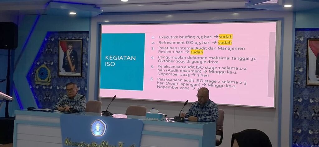 Rapat ini menjadi langkah strategis dalam rangka memastikan kesiapan universitas menuju sertifikasi ISO 9001:2015 (Manajemen Mutu) dan ISO 21001:2018 (Sistem Manajemen Organisasi Pendidikan) sebagai upaya memperkuat tata kelola dan peningkatan mutu layanan akademik maupun non-akademik.